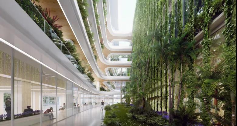 花園式醫(yī)院追求綠意盎然自然治愈,讓空間充滿生機和活力。主要通過內(nèi)裝設(shè)計來打造,可以采用局部綠植墻點綴空間,合理利用采光中庭及庭院,實現(xiàn)室內(nèi)室外借景,也可以局部植入綠植景觀小品,增強細節(jié)感。