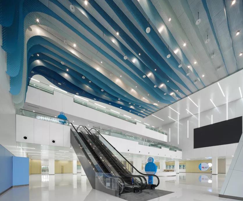 醫(yī)技樓門診空間人流量較大,功能上屬于集約等候、辦理、中轉(zhuǎn)、接待的樞紐性空間,集約滿足未來就醫(yī)功能的信息化體現(xiàn),進行人工掛號+線上自組掛號系統(tǒng)、互動屏幕等點位設(shè)置,在營造婦女兒童醫(yī)院氛圍同時,采用簡潔照明系統(tǒng)和耐久易清潔環(huán)保材料,在醒目多變色彩空間中相對更加突出簡潔、白凈,便于識別。