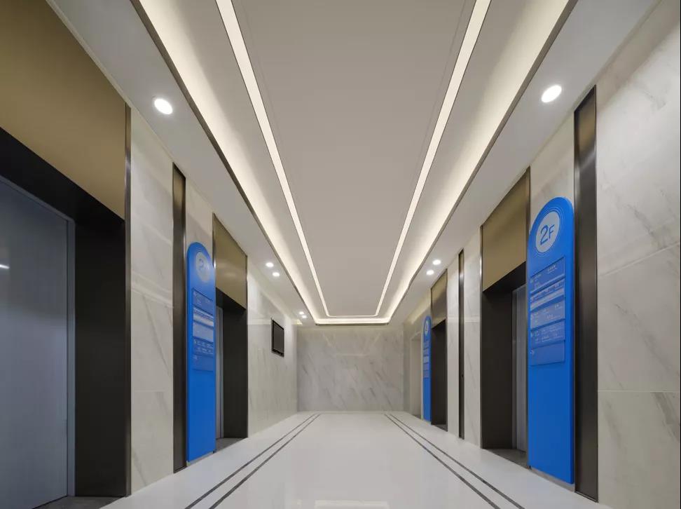 ▲ 圖45 人性化/專業(yè)化/尊貴化:醫(yī)技樓電梯廳采用易于引導(dǎo)標識系統(tǒng)、防炫光暗藏?zé)艄狻⒉捎檬暮筒讳P鋼材質(zhì)品質(zhì),體現(xiàn)空間品質(zhì)感特性