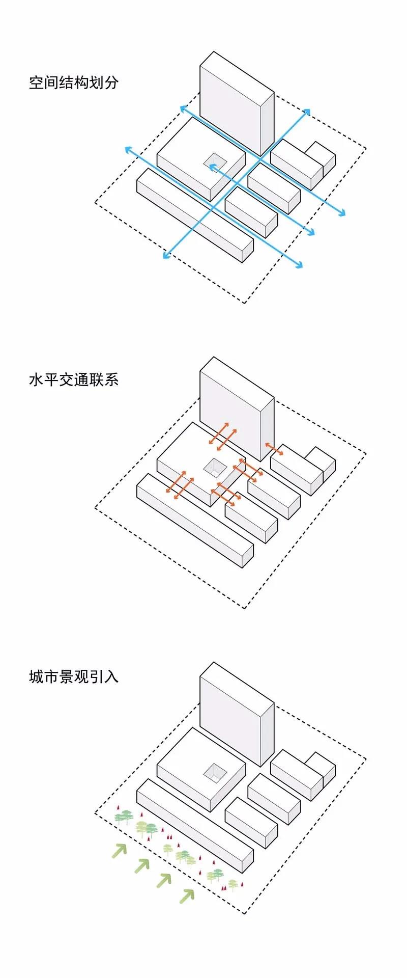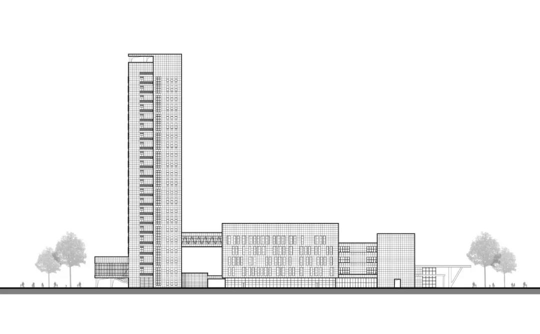 CAPOL負(fù)責(zé)進(jìn)行從方案到施工圖全過(guò)程的建筑設(shè)計(jì)總承包工作,創(chuàng)造性地采用“緊湊型三角形結(jié)構(gòu)”:以醫(yī)療技術(shù)部門為核心,門診部將布置在人流較多的城市主干道,住院部是遠(yuǎn)離城市主干道和噪音源的。三角形布局形成的最短會(huì)診、急救流線和分層掛號(hào)系統(tǒng),創(chuàng)造出了高效的就醫(yī)體驗(yàn)。