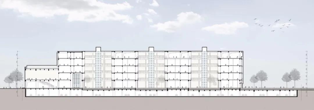 設(shè)計(jì)將庭院綠化、屋頂綠化、入口廣場(chǎng)綠化等分散的景觀系統(tǒng)引入建筑,同時(shí),分散的庭院綠化與醫(yī)院交通軸平行,采用退臺(tái)式綠化平臺(tái),最大化每層候診空間的采光和綠化景觀,拉近患者與大自然的距離,提升空間感受的豐富性,形成一個(gè)平靜和充滿治愈力的建筑空間。