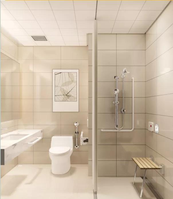 洗手間無障礙扶手、洗浴椅等建議使用PVC材料,也可采用防水復(fù)合板和不銹鋼支撐,為減少空間占用也可采用掛墻式洗浴椅,有的醫(yī)院在空間允許的條件下設(shè)置了砌體貼磚結(jié)構(gòu),但要注意施工防水作業(yè)。窗簾隔簾采用A級(jí)防火材料,嵌入式導(dǎo)軌為宜。